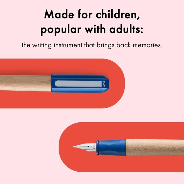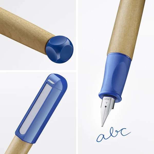Child-friendly learn-to-write fountain pen with polished steel nib. Non-slip, ergonomic grip, high-quality cap and roll-stop in the shape of a cube made of high-quality plastic. Robust body made of maple wood. Available in different nib widths and also for left-handers. Including 1 ink cartridge LAMY T 10 in blue. Recommended accessories: LAMY Z 28 converter for use with ink glass.