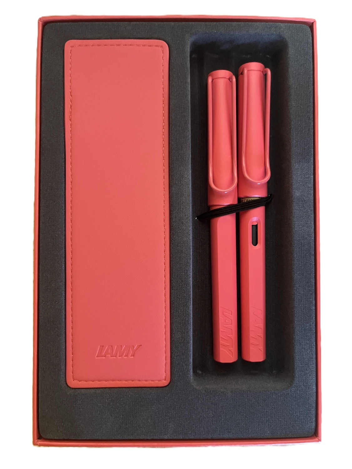 Lightweight fountain pen with polished steel nib and ergonomic grip made of high-quality transparent plastic. Distinctive metal clip and resistant body made of coloured anodised aluminium. Including 1 ink cartridge LAMY T10 in blue. Available in different nib widhts and also for left-handers. Recommended accessories: converter LAMY Z28 for use with ink glass.