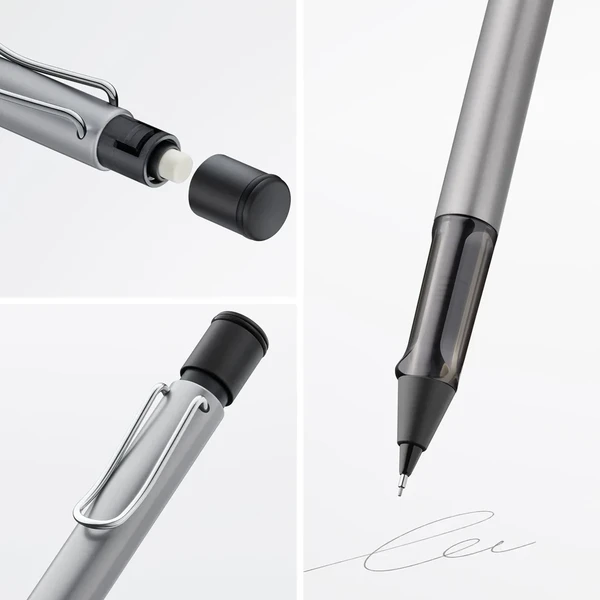 Lightweight mechanical pencil with ergonomic grip made of high-quality tansparent plastic. Distinctive metal clip and resistant body made of anodised aluminium. Including lead LAMY M 41 in size 0,5mm and eraser LAMY Z 18 with cleaning needle.