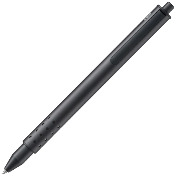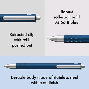 The LAMY swift is a rollerball pen whose straightforward design is full of thoughtful details. It combines the pleasant writing feeling of ink with the robust functionality of a biro. The interaction of clip and pusher is particularly ingenious: when the refill is pushed out and ready to write, the clip retracts to prevent accidental insertion. Inside the LAMY swift, the best rollerball refill on the market, the LAMY M 66, ensures a smooth and fluid writing experience. The durable all-metal casing features punched-out structures on the grip section: they not only serve as a visual focus, but also provide a comfortable grip while writing.