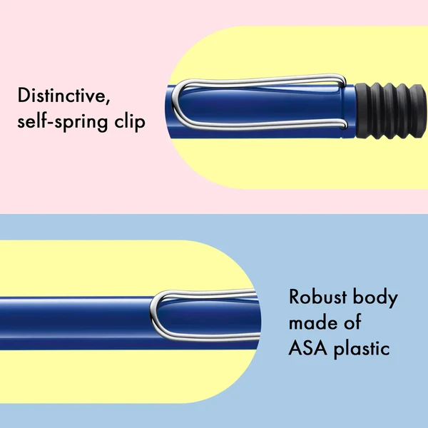 Fountain pen, icon, global success: the LAMY safari has been a beloved classic since its introduction in the 1980s and enjoys a cult status untypical for a writing instrument. Countless colours and ever-changing special editions make hearts beat faster - whether for the pencil case or the carefully curated fountain pen collection. The LAMY safari is more than the sum of its details: it is aesthetic, robust and individual. The distinctive, self-sprung clip keeps the writing instrument securely fastened in place. The housing, which is made of impact-resistant plastic, makes it a robust companion in any environment and the flattened shape prevents it from accidentally rolling away. Functional details such as subtly ergonomically shaped grip surfaces and a viewing window for checking the ink level blend naturally into the design and make the LAMY safari a modern classic.