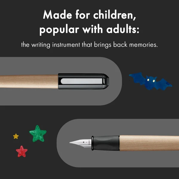 Child-friendly learn-to-write fountain pen with polished steel nib. Non-slip, ergonomic grip, high-quality cap and roll-stop in the shape of a cube made of high-quality plastic. Robust body made of maple wood. Available in different nib widths and also for left-handers. Including 1 ink cartridge LAMY T 10 in blue. Recommended accessories: LAMY Z 28 converter for use with ink glass.
