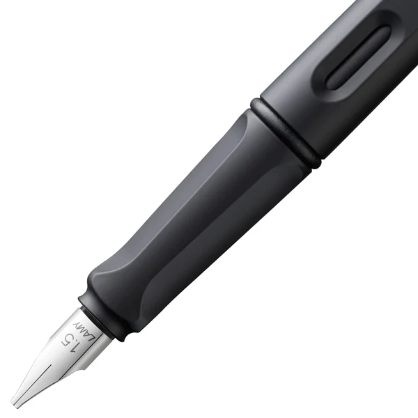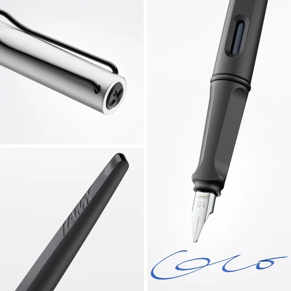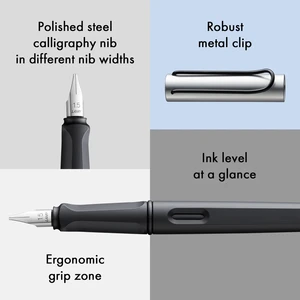 Expressive calligraphy fountain pen with polished steel calligraphy nib and ergonomic grip. Robust cap made of anodised aluminium and body made of high-quality ASA plastic. Includes 1 LAMY T 10 ink cartridge in blue. Available in different nib widths and also for left-handers:inside. Recommended accessories: LAMY Z 28 converter for use with ink glass.