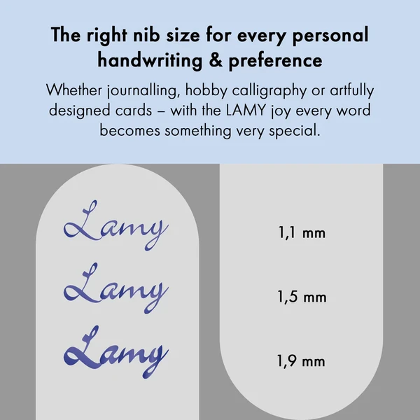 Discover the LAMY joy: it is the perfect writing instrument for anyone who wants to express their creativity and personality. The pen is equipped with a ribbon nib that makes creative lettering and more demanding calligraphy work easy - and the nib tip also adds a very special touch to any handwriting in everyday life. The overall appearance and the ergonomic grip are based on the design of the cult fountain pen LAMY safari, while the tapered body epitomises a homage to traditional nib pens. Whether journalling, hobby calligraphy or artfully designed cards – with the LAMY joy every word becomes something very special.