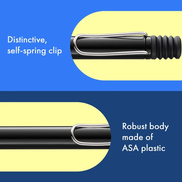 Ballpoint pen for everyday use with ergonomic grip. Distinctive metal clip and robust body made of resistant, high-gloss ASA plastic. Including giant ballpoint pen refill LAMY M 16 in size M in black.