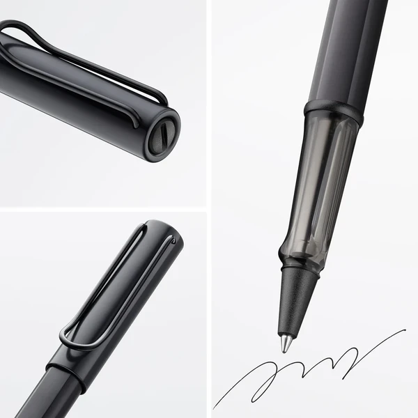Lightweight rollerball pen with ergonomic grip made of high-quality transparent plastic. Distinctive metal clip and resistant body made of anodised aluminium. Including rollerball pen refill LAMY M 63 in size M in black.